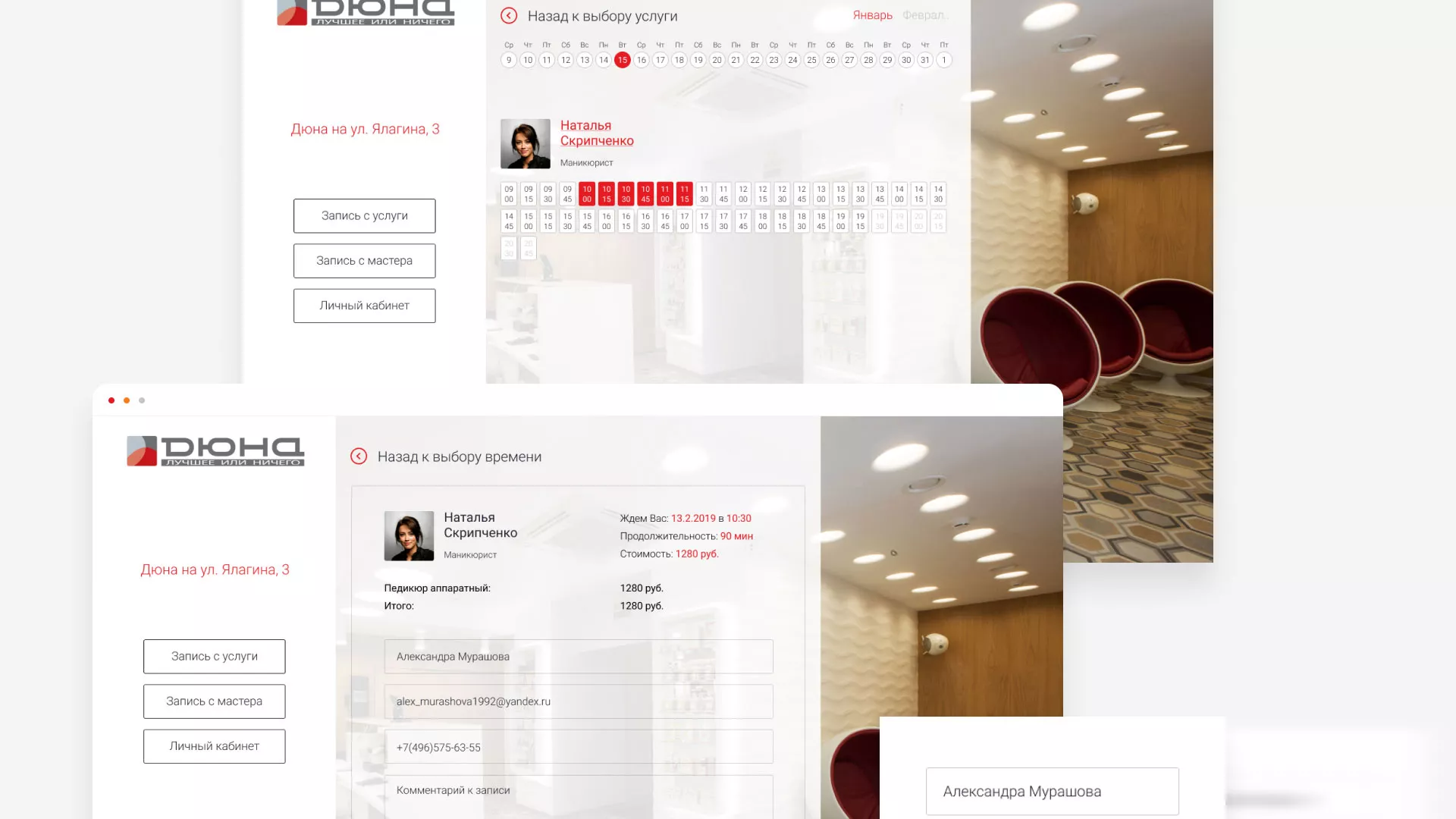 В разделе «Личный кабинет» содержатся все текущие записи в салоны красоты в Дмитриеве, с возможностью их отмены. Также, здесь можно редактировать свои персональные данные, ознакомиться с историей записей и видеть бонусы и акции салонов красоты.